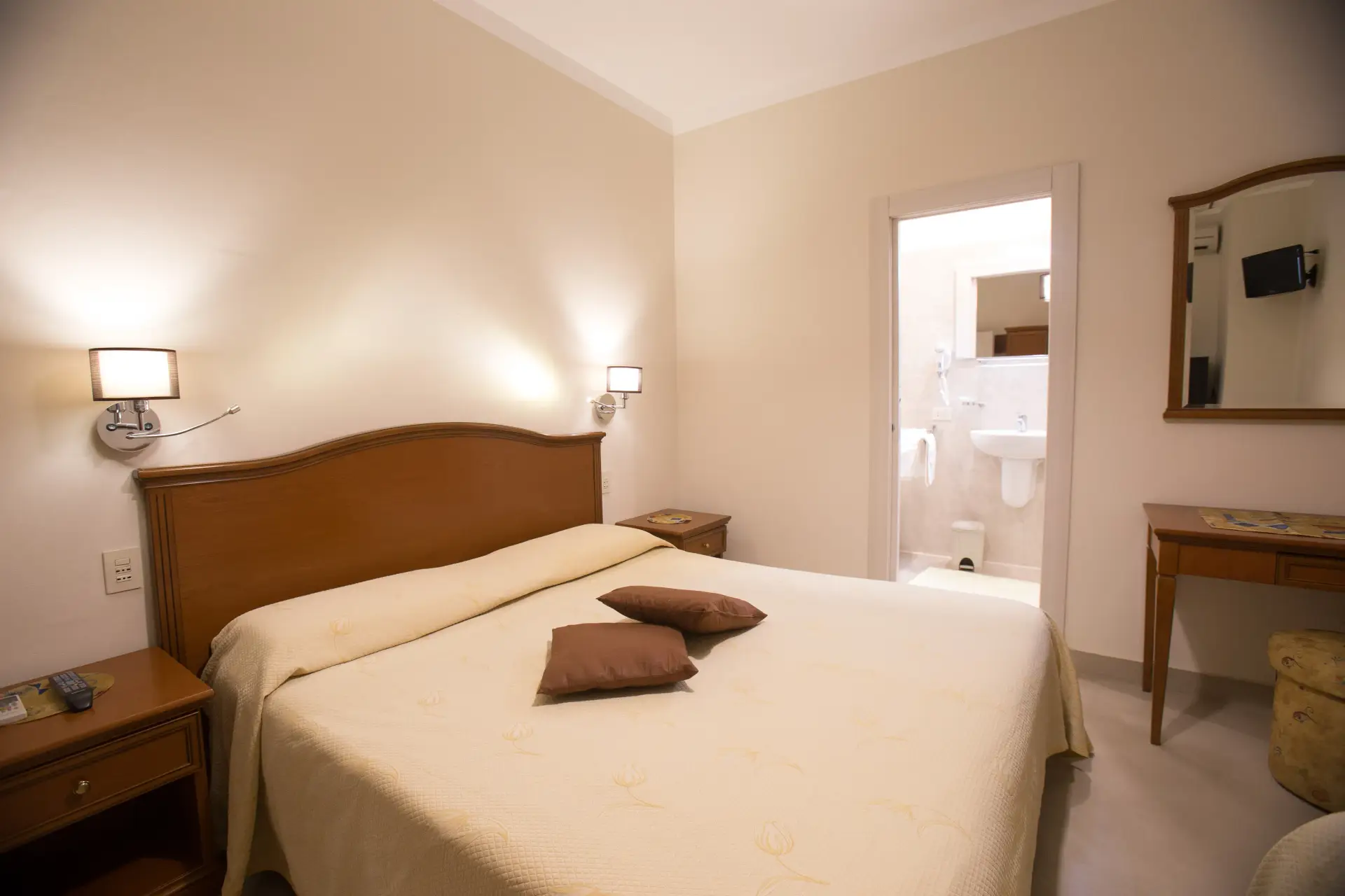 Le camere, accoglienti e ben arredate, offrono un piccolo salottino per momenti di relax e un mini bar per soddisfare ogni esigenza. Ogni stanza dispone di TV a schermo piatto con canali satellitari, impianto di climatizzazione per il massimo comfort e bagno privato completo di doccia, WC, bidet, asciugacapelli e asciugamani. Ogni dettaglio è studiato per rendere il soggiorno piacevole e senza preoccupazioni, offrendo un equilibrio perfetto tra praticità e ospitalità.